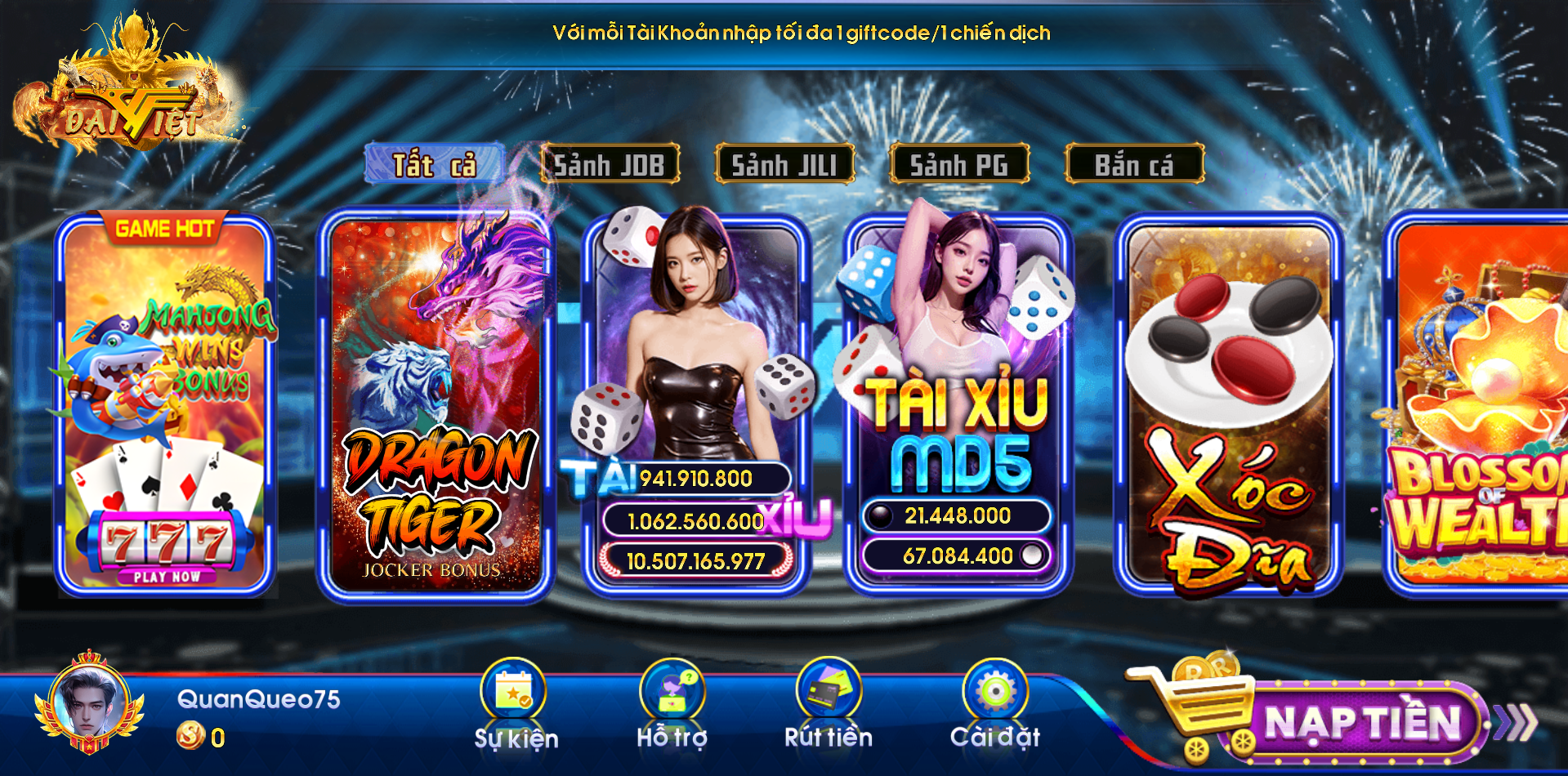 Hội viên chỉ cần Đăng Ký ngay cho mình một tài khoản tại Daiviet88 Pro Có thể nhận ngay một mã Code lên đến 100K để trải nghiệm những trò chơi tại đây.